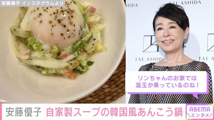 安藤優子(65)、“自家製”韓国風あんこう鍋&シーザーサラダ風を披露「体の芯から温まる」「温玉が乗っているのね!」と絶賛の声 ABEMAエンタメ 2023/11/26 13:46 拡大する 長年フジテレビの報道番組でキャスターを務め、現在はジャーナリストとして活動する安藤優子(65)が、自宅で自家製スープの韓国風あんこう鍋を披露した。【映像】安藤優子の手作り韓国風あんこう鍋(実際に料理する様子も) 安藤はInstagramで“等身大のアンド―”を伝えることにしているとのことで、「キッチンで話そ!」というシリーズの料理動画や、出かける際のコーディネート、愛犬との仲睦まじい様子などを投稿している。 続きを読む