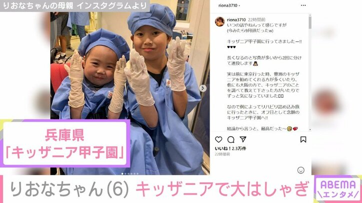 先天性疾患をもつ6歳のYouTuberりおなちゃん、治療・リハビリの合間にキッザニアで大はしゃぎ「車椅子でも全然不自由せずに1日過ごすことが出来ました」 ABEMAエンタメ 2023/12/01 08:37 拡大する 先天性疾患による低身長というハンディキャップがありながらも、大人びた明るいキャラクターが人気で、YouTubeのチャンネル登録者数が117万人以上いる「ちいりおちゃんねる」のりおなちゃん(6)。母親がInstagramを更新し、リハビリの合間に訪れた職業体験施設「キッザニア」での様子を紹介した。【映像】職業体験を楽しむりおなちゃん(複数カット) 6歳児ながら93cmと、3歳児ほどの身長しかないというりおなちゃん。2022年5月に受けた背骨の手術の影響で体がマヒし、歩けなくなってしまったという。2023年9月には、大阪の病院で再生医療を受け始めたことを報告していた。りおなちゃんは隔週で大阪を訪れ、治療やリハビリに励んでいるそうだ。 続きを読む
