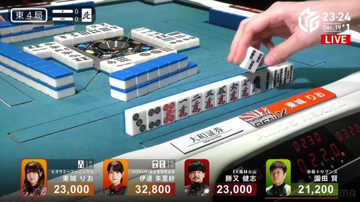 しなやかな指から生まれる華麗なサイドスピン 東城りお、上品さ漂う一発ツモに視聴者は「お見事!」「一瞬時が止まった」と喝采/麻雀・Mリーグ Mリーグ 2023/12/20 19:00 拡大する 長くしなやかな指から生まれた華麗な牌のサイドスピンに、ファンもうっとりだ。プロ麻雀リーグ「大和証券Mリーグ2023-24」12月19日の第1試合で、セガサミーフェニックス・東城りお(連盟)が、アガった瞬間に牌を横に回転させる手さばきで、視聴者を楽しませた。【映像】東城りお、指先クルッとサイドスピンのツモ 東城といえばモデル顔負けの高長身に整った顔、攻撃的な麻雀でトップクラスの人気を誇る選手。試合後のインタビューでは勝っても負けても爽やかな笑顔を絶やさず、その飾らない雰囲気がまた支持されている。今期は個人成績で低迷すると、チーム成績も大きくマイナスが積み上がり8位と苦戦中。なんとか流れを変えるべく、長い髪に巻きを入れたゴージャンス感のあるヘアスタイルで登場すると、東4局では指技を見せた。 続きを読む