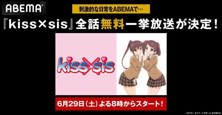 禁断のラブコメ『kiss×sis』6月29日(土)、30日(日)に全話無料一挙放送が決定 2024/06/28 21:40 拡大する ABEMAにて、大人気ラブコメディ『kiss×sis』が、6月29日(土)、30日(日)に全話無料一挙放送される。【放送】アニメ『kiss×sis』全話一挙 『kiss×sis』は、「月刊ヤングマガジン」(講談社)で連載されていた、ぢだま某によるラブコメ漫画を原作としたアニメ作品。性に積極的な美少女双子姉妹と、そんな姉妹に溺愛され、翻弄される弟の騒がしい日常が描かれる。2010年にTVアニメ化された本作は、当時“禁断のアニメ化”としても話題を呼び、可愛らしいキャラクターが織りなす刺激的な日常や、ギリギリな展開が人気を博した。 続きを読む 2025秋アニメ(10月クール) 作品情報 もっとみる(74) ディズニー ツイステッドワンダーランド ザ アニメーション シーズン1「エピソード オブ ハーツラビュル」 シルバニアファミリー フレアのワンダーデイズ 矢野くんの普通の日々 顔に出ない柏田さんと顔に出る太田君 僕のヒーローアカデミア FINAL SEASON さわらないで小手指くん