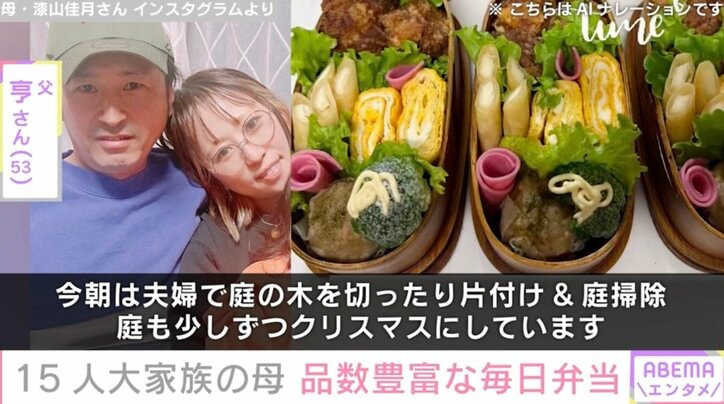 15人大家族「うるしやま家」の47歳母が作る品数豊富な毎日弁当 ABEMAエンタメ 2024/12/04 16:00 拡大する 6男7女・15人の大家族「うるしやま家」の母親・佳月さん(47)が、子どもたちに作った毎日弁当を公開した。 SNSで、40分で作った13人分のオムライスや、15人分のお弁当などを紹介している、料理上手な佳月さん。「15人分は尊敬」「なかなかマネできないです」などの反響が寄せられていた。 春からは、毎朝5時前に起きて、高校3年生の次男・凛さん、高校2年生の三男・璃さん、そして高校1年生の四男・瑠さんと、3人分のお弁当を作っている。 続きを読む