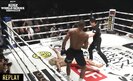 トリンダーデは大きく後ろにサークリング、ここまでの2分半の攻防では見せなかった動きを見せる。カーフ対策に原口の蹴り足への関節蹴りからクリンチ。ブレイク直後、前に踏み込む原口へ高速のバックブロー。これは避けられるが、間髪入れず左ハイを放つとひと呼吸おいて右の振り回すようなストレート。腕がしなるように伸び、テンプルを捉えると“ボコッ”という音とともに原口が横から崩れ落ちて大の字で天井を仰いだ。