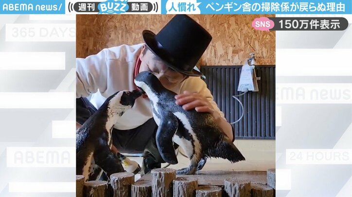 掃除に行った飼育員が帰ってこない…ペンギンと掃除係の“微笑ましい様子”に「コレは帰れない」「いいなぁ…羨ましいなぁ…」と反響 週刊BUZZ動画どうぶつ 2025/01/25 15:45 拡大する 「ペンギンエリアの掃除に行ったはずの飼育員が戻らぬ理由」というコメントと共に投稿された、掃除係とペンギンの動画が、SNSで話題となっている。 注目を集めているのは、飼育小屋の掃除をしている男性の周りに、ケープペンギンたちが集まってきて離れない様子が映っている動画。ペンギンたちは、男性の手をくちばしでつつくなどしてアピール。これに男性もニコニコの笑顔でペンギンをなでている。 男性は元水族館飼育員の「イマイケル」さん。動物とのふれあい活動をする「劇団ペンダーズ」を立ち上げ、自らの経験を活かしてペンギンたちの飼育を行っているそう。 続きを読む
