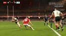 ビッグプレーが飛び出したのは55分。13-18と5点を追うアイルランドはトライエリアまで7~8メートル、グラウンド中央というところでラックを形成。ここからSHのジャミソン・ギブソン=パークが、大きく左サイドぎりぎりを狙ってパントキックを上げた。