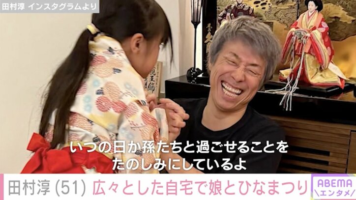 田村淳(51)、 “豪邸が過ぎる”と話題の自宅で娘2人と楽しむひなまつり「あつしパパのうれしそうな顔サイコー」ファン注目 ABEMAエンタメ 2025/03/06 11:15 拡大する お笑いコンビ「ロンドンブーツ1号2号」の田村淳(51)が、娘たちと自宅でひな祭りを楽しむ様子を公開した。 2013年9月に結婚を発表し、8歳と4歳の娘を育てている田村。 これまでにもInstagramで、庭に置かれた巨大なプールで遊ぶ親子ショットや、広々としたリビングで娘たちと大縄跳びをする様子など、自宅で家族と過ごす日常をたびたび発信。ファンからは「豪邸が過ぎる」「大きなプール お金持ちだなぁ」など、反響の声が寄せられていた。 続きを読む