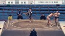 序二段百枚目・隈錦(武隈)と序ノ口二枚目・森麗(大嶽)の一番での出来事。立ち合い勢いよく当たったのは隈錦。頭をつけて攻める森麗が前に出たが、隈錦は一気に押し返して前進。そのまま土俵の外へと押し出した。