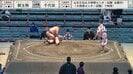 三段目三十三枚目・朝玉勢(高砂)が三段目二十九枚目・千代栄(九重)を突き落としで下し全勝対決を制した一番。立ち合い頭を下げて真っ直ぐに当たった朝玉勢。突き押しの攻防を繰り広げると、千代栄が果敢に攻め、朝玉勢ははたかれてバランスを崩しそうになる場面も。なんとか持ち堪えた朝玉勢は土俵際、粘って逆転の突き落としを決めて勝利した。