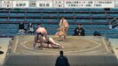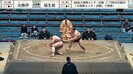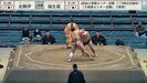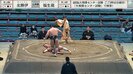 序二段八枚目・北勝伊(八角)が序二段七枚目・福生龍(湊)を強烈な突き倒しで2勝目を挙げた一番でのこと。