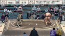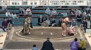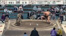 幕下十三枚目・聖富士(伊勢ヶ濱)と幕下十八枚目・延原(二子山)の一番。立ち合い鋭い相手の当たりに体が起き上がった聖富士。押し返そうとするも、延原にはたかれて前のめりにバランスを崩してしまう。だが持ち堪えた聖富士は直後、延原のまわしを探ると、クルリと素早く背後を取って羽交締めするような格好になった。まさかの展開に館内騒然。延原はなんとか後ろ向きのまま押そうとするも通用せず、聖富士が背中から引き落として勝利した。