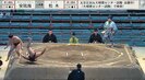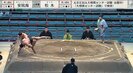 序二段五十五枚目・安琉海(安治川)と序二段五十三枚目・松木(田子ノ浦)の一番。沖縄県浦添市出身の19歳・安琉海は立ち合い後、突っ張ってくる松木に押されて土俵際まで追い込まれてしまう。だが耐えると、いなして回り込む粘り強い攻めを展開。激しい突っ張り合いとなったが、最後は土俵際、松木が小手投げ気味に安琉海を投げながら土俵の外へ出ていった。このとき、安琉海も必死に粘って宙に浮き、1回転して受け身を取った。大迫力の身のこなしに客席からはどよめきが沸き起こった。
