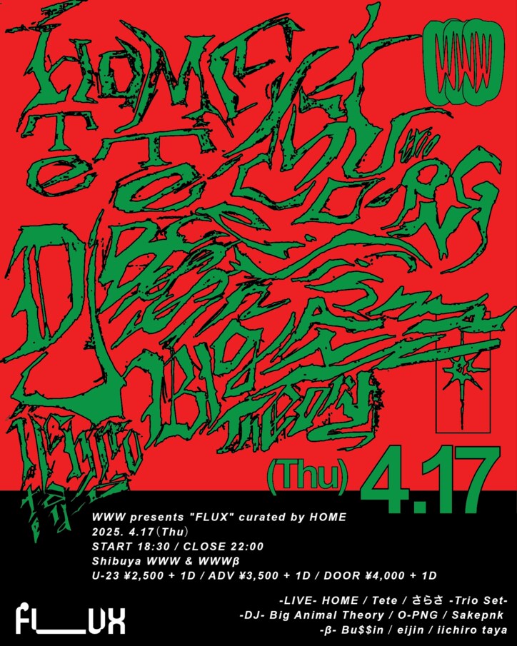 WWWによる新企画が始動!初回は沖縄のニューホープ、HOMEがキュレーション。 2025/03/25 12:22 拡大する WWWによる新企画<FLUX>が始動。 本イベントは様々なアーティストがキュレーターとして、WWWとWWWβを舞台にライブ3組、DJ3組、βでDJ3組という「3×3×3」のルールのもと、キュレーションすることによって現代の様々なシーンやアーティストのバックグラウンドを可視化していくイベントとなる。 初回は沖縄のオルタナティブバンドHOMEがキュレーターを担当。今回HOMEが選出したのは、HOMEと同様に沖縄を拠点に活動する話題のラッパーTete、同世代のシンガーとして様々なフェスなどでも共演経験のあるさらさがTrio setとして出演。 続きを読む
