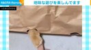 飼い主によると、今回は穴を開けたら手を出して遊ぶかなと思い3カ所開けたところ、このように遊びだしたとのこと。