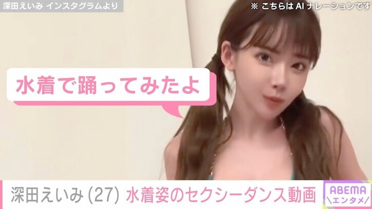 深田えいみ、水着姿のセクシーダンスにファン大興奮「最高すぎる!」「可愛さ爆発」 ABEMAエンタメ 2025/04/01 17:47 拡大する セクシー女優の深田えいみ(27)が31日、Instagramを更新した。ビキニ姿でダンスを踊るセクシーな動画を投稿し「最高すぎる!」「可愛さ爆発!」など、様々な反響が寄せられている。 SNSの総フォロワー数が約1400万人の深田は、Instagramに透け感が妖艶なスーツ姿や、白バニー姿など、色気あふれる衣装でのダンス動画を投稿している。3月31日は、「水着で踊ってみたよ」と、ツインテールのビキニ姿で踊るセクシーな動画を披露した。 続きを読む