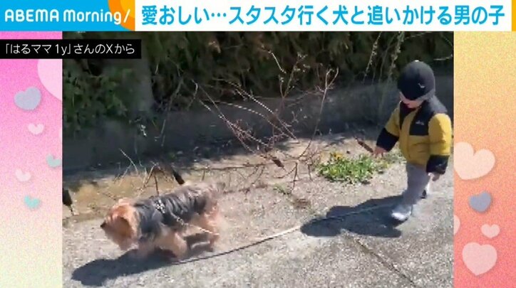 散歩中のヨークシャー・テリアとリードを一生懸命拾おうとする1歳半の子どもの“かみ合わない”姿に「愛やね」「可愛すぎます」と反響 ABEMA Morningどうぶつ 2025/04/05 11:50 拡大する 散歩中の犬と1歳半の子どもの“かみ合わない”様子が、ネット上で話題となっている。 「旦那から送られてきた動画 愛おしい」というコメントとともに飼い主(@0905k_h)が投稿した動画には、リードを中々掴むことができず追いかけるはるくん(1歳半)と、お構いなしにスタスタと歩き続けるヨークシャー・テリアのるぅくん(7歳)の姿が映っている。最初ははるくんがリードを持ってお散歩していたそうだが、途中でリードを落としてしまい、がんばって、拾おうとしているという。 続きを読む