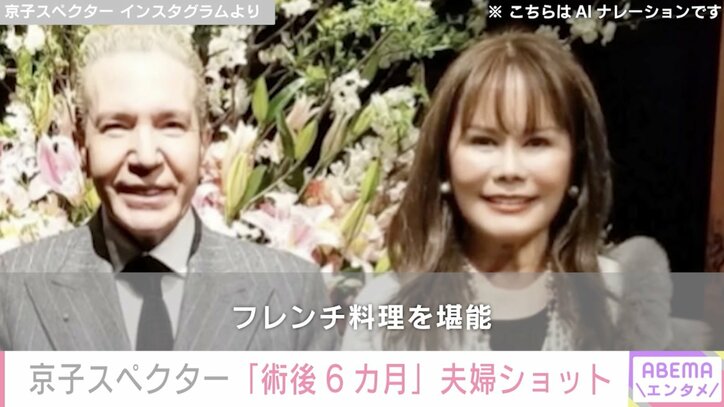 “乳がん公表”デーブ・スペクターの妻 京子スペクター「術後6カ月」夫婦ショット公開 ABEMAエンタメ 2025/04/11 11:49 拡大する 乳がんを公表していたデーブ・スペクターの妻でエッセイストの京子スペクターが、「術後6カ月」とコメントし、夫婦ショットを公開した。 3月5日、テレビ朝日系のトーク番組『徹子の部屋』に夫婦で出演した京子。2024年に乳がんを発症し、両胸の摘出手術を受けたことを明かしており、退院日にはデーブが医者のコスプレで出迎えてくれたという。 Instagramでは、番組で語っていた医者のコスプレをしたデーブの写真や、東京ドームで開催されたロサンゼルス・ドジャース対シカゴ・カブスの試合を観戦している様子など、仲むつまじい夫婦ショットを公開している。6日の投稿では、「術後6カ月、快気祝いにデーブからのサプライズ。ホテルニューオータニ東京にあるトゥールダルジャンにてフレンチ料理を堪能」と、デーブとの写真を添えて、夫婦時間を満喫したことを明かした。 続きを読む