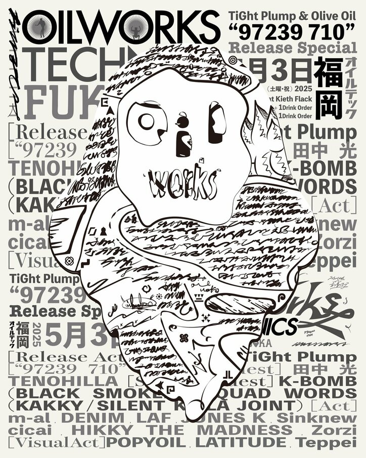 TiGht Plump & Olive Oilとのコラボアルバム、”97239 710”のリリーススペシャルとして、OILWORKS TECHNICS FUKUOKA 2025を2年振りに福岡・KIETH FLACKで開催 2025/04/14 09:51 拡大する OILWORKS TECHNICS、2年ぶりに福岡・KIETH FLACKで開催!今回は、ラップクルー TiGht Plump と Olive Oil によるコラボアルバム『97239 710』 のリリーススペシャルを兼ねた一夜。アルバムに参加した田中 光、W@R(TENOHILLA) をはじめ、 BLACK SMOKERからK-BOMB、KAKKY、SILENT KILLA JOINT によるユニット SQUAD WORDS が登場。 続きを読む