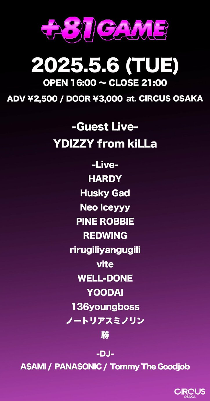 話題のアーティストのライブパフォーマンスやインタビューを届けるYouTubeチャンネル「+81 GAME」初のライブイベントが5月6日に開催 2025/04/27 11:45 拡大する 2024年10月に発足され、これまでにYDIZZYやFANI, S-kaine, 136youngbossなど話題のアーティストのパフォーマンスやインタビューを毎週届けているYOUTUBEチャンネル『+81Game』(プラス エイティーワン ゲーム)が、ゴールデンウィークに初のライブイベントを開催する。ヘッドライナーにYDIZZYを迎え、チャンネルに出演したアーティスト総勢13組のライブを生で体感できる絶好の機会だ。 続きを読む