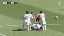 サンフレッチェ広島のMF川辺駿が後ろから激しいスライディングタックルを繰り出した。新潟MFが悶絶する危険なプレーとなったがノーカードの判定となり、ファンが不満を示している。