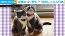 実はこの直前まで2匹で激しく“ニャンプロ”をしていたのだそう。ごましおくんが両前足でしらたまくんの肩を押さえ込んでいたところ、ふとした瞬間、今回のように、まるで肩を組んでいるようなポーズになったとのこと。