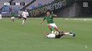 ハイラインを敷いていた横浜FCは、ンドカ・ボニフェイスが対応。快足を飛ばして川﨑に追いついた。次の瞬間、左足を伸ばしたスライディングを敢行。後方からのタックルを見舞うと、川﨑が転倒してファウルかと思われたが笛は吹かれず。プレーは続行され、東京Vのサポーターからは大ブーイングが飛んだ。