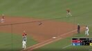 1-4、ドジャース3点のビハインドで迎えた5回裏・ドジャースの攻撃、1死走者なしの場面で打席に立った9番のキムは、エンゼルス先発のジャック・コハノウィッツに対し、しっかりとボールを見極めながらカウント2-2とすると、勝負の5球目、真ん中外寄り、やや低めのコースへと投じられた145km/hのチェンジアップをしっかりと叩いて一、二塁間へと転がる球足の速いゴロに。しかしエンゼルス守備陣も果敢にこの打球を止めようと反応。ファーストのノーラン・シャヌエルは捕球が間に合わなかったものの、セカンドのティム・アンダーソンが深めのところで追いつき、走りながらも懸命に一塁カバーのコハノウィッツへと送球。しかし金の足を気にするあまりか、送球が右へと逸れてファウルゾーンを転々。その間にキムは一塁を駆け抜け、見事、出塁することとなった。