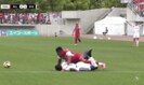 新潟が自陣でビルドアップをする中、ボールがゲリアの下へ。すると、ルカオがプレスを仕掛けて一気に間合いを詰めた。ゲリアは右足でのキックフェイントでルカオをかわそうとしたが、ルカオはフェイントに引っかかることなくそのままアプローチ。そのまま両者は激しく激突したのだ。