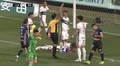 ゴール前へ蹴られたクロスをG大阪FW・ファンアラーノが頭で合わせにいくと、遅れて津久井も突っ込んでいき、そのまま相手と接触。頭から血を流し、そのままピッチに倒れ込んだ。