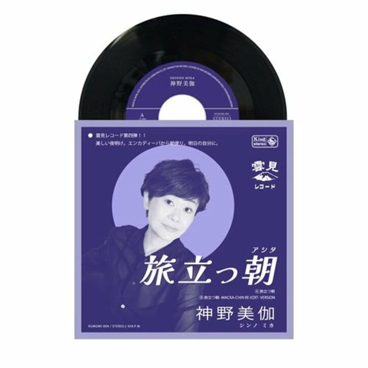 MACKA-CHINによるレーベル・雲見レコードからリリース第4段となる、演歌界のディーヴァ神野美伽が歌う、江利チエミの名曲「旅立つ朝(あした)」のカバーを収録した7インチレコードがリリース。 2025/06/06 12:00 拡大する 雲見レコード第4弾!演歌界のディーヴァ神野美伽が歌う、江利チエミの名曲「旅立つ朝(あした)」のカバーを収録した初の7インチレコードを2025年6月6日リリース。本作には、MACKA-CHINによるリエディット・ヴァージョンも収録されており、和モノファン必携の一枚。「旅立つ朝(あした)」は、和モノファンにはお馴染みの村井邦彦氏が作曲し、江利チエミによって歌われた71年リリースの名曲の一つ。その楽曲を、演歌・ジャズ・ポップスとジャンルを越えて長年にわたり実績を積んできた実力派シンガー・神野美伽が2022年に新たな解釈でカバーした楽曲であり、今回KING RECORDSの正式なライセンスのもと、雲見レコードがアナログ化に成功。 続きを読む
