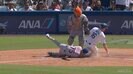 キャッチャーが捕球できず、ボールは大きく後方に跳ね上がる。そこに素早くカバーに入っていた2番手投手ギャレットがキャッチ。スライディングでホームを踏もうとするスミスにタッチに行こうとした。しかし、目の前にいた捕手が壁となってしまい、ギリギリのところでグラブはスミスに届かず。