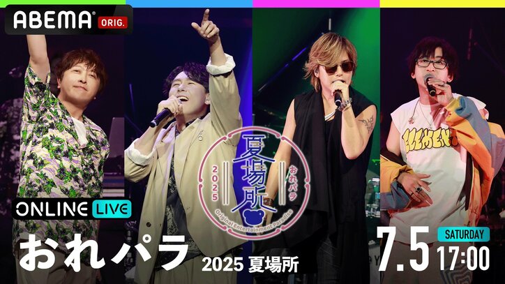 ABEMAにて、7月5日(土)17時より開催される、男性声優アーティストたちによる音楽の祭典『Original Entertainment Paradise -おれパラ- 2025 夏場所』(以下『おれパラ 2025 夏場所』)がABEMA PPVにて独占生放送される。