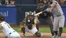 一見、甘く入った打ちごろの軌道に見えるものの、いざバットを振り出すと、手元で大きく外へと逃げて行くこの1球に、マッキャンはあえなく空振りして呆然。微妙な表情のまま、ベンチへと引き上げていくこととなった。こうしたダルビッシュの“魔球”ともいえる変化量の大きいスイーパーと、マッキャンの凡退リアクションにファンからは「これは打てない」「エグすぎる」「ドン引き」「この軌道は見分けがつかない」「振っても振らなくても三振」「さすが魔球王」といった様々な反響が巻き起こることに。