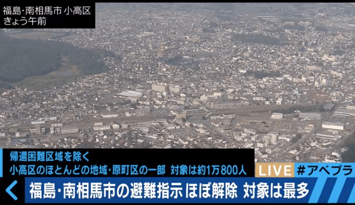南相馬市の避難指示解除も、未だ問題山積み 専門家が語る 2016/07/13 07:00 拡大する 7月12日、福島・南相馬市小高区のほぼ全域と原町区の一部地域の避難指示が解除された。対象はおよそ1万800人と過去最大規模の避難指示解除となる。また、避難指示の解除に合わせ、不通となっていたJR常磐線の運行も再開した。未だ除染作業が続く中、戻ってくる意向を示す人はおよそ2割。東日本大震災、原発事故による避難指示からは約5年4ヶ月。現在の状況はどうなっているのだろうか。7月12日にオンエアされた「AbemaPrime」ではこのニュースについて取り上げた。 続きを読む