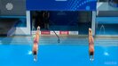 10mの高さから演技のタイミングを全て合わせて入水するシンクロ高飛込。見た目も派手なだけに、きれいに揃えば揃うほど迫力が出る。メキシコペアは2人でプールを背にした状態で踏み切り位置でつま先立ちになると、合図とともに飛び出し勢いよく背中側から回転。難易度3.2の5253B(後ろ宙返り2回半1回半捻りエビ型)をきれいに決めると、入水のタイミングもしっかりと合わせた。
