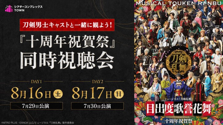 ミュージカル『刀剣乱舞』を刀剣男士キャストと一緒に!『十周年祝賀祭』同時視聴会開催 2025/08/07 15:15 拡大する 2025年7月29日(火)・7月30日(水)に東京ドームで行われた「ミュージカル『刀剣乱舞』 目出度歌誉花舞 十周年祝賀祭」の映像を、刀剣男士キャストたちと一緒に視聴する同時視聴会の開催が「シアターコンプレックスTOWN」にて決定した。 ミュージカル『刀剣乱舞』(略称「刀ミュ」)は、人気PCブラウザ・スマホアプリゲーム「刀剣乱舞ONLINE」を原案とした、2.5次元ミュージカル作品。2015年のシリーズ初演以来、国内外での公演やライブを重ね、2025年10月に10周年を迎える。 続きを読む 2025秋アニメ(10月クール) 作品情報 もっとみる(74) 東島丹三郎は仮面ライダーになりたい 太陽よりも眩しい星 コアラ絵日記 永久のユウグレ らんま1/2 第2期 終末のワルキューレ 3期