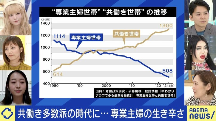 “共働き世帯”が多数派…時代の変化に河崎環氏「2000年代は専業主婦が正義」「『ワーママはわがまま』と言われていた」 ABEMA Prime 2025/08/17 10:00 拡大する かつて多数派だった「専業主婦」は、今は全体の3割を切っている。専業主婦に対して、ネットでは「女性が社会進出できる時代になぜ専業主婦?」「お金を稼げず生産性がない」などの心ない声があがっている。そんな時代の変化を、コラムニストの河崎環氏が『ABEMA Prime』で振り返った。 河崎氏は、「1996年に第1子、2005年に第2子を産んでいるが、あの頃は専業主婦が正義だった。子供を産んだら専業主婦になって、家族のために尽くすのが当たり前の時代。そうでないお母さんをワーキングマザーと呼んでいたが、『ワーママはわがまま』と言われていた。私は2000年代からライターになったが、当時1番ヒットしたトピックは『専業主婦VSワーママ』。あとは、『PTAにおけるママ友同士の確執』を書くと、バンバン燃えた。なんでかというと、ワーママは専業主婦を責めたい、専業主婦はワーママを責めたい。それが2000年代だった」と振り返る。 続きを読む