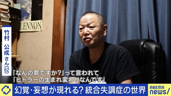 視界が“ブルーの世界”に、「ヒトラーの生まれ変わり」と確信し交番に自首 38歳で“統合失調症”が現れた当事者に聞く症状 周囲の接し方は ABEMA Prime 2025/08/17 14:00 拡大する ミュージシャンとして活動する竹村公成さん(62)。24年間にわたり、統合失調症と向き合っている。自分の考えや気持ち、行動がうまくまとまらず、幻覚や妄想といった症状が現れる精神疾患で、患者数は日本国内で約90万人と言われている。 竹村さんに兆候が現れたのは、ベンチャー企業の役員として働いていた38歳の時だった。「会議やプレゼンの席でしゃべることが大げさになり、『おかしな事を言い出している』と言われるようになった。いろんな人と衝突して、もめ始めて、みんな僕が『病気になった』と言い出した」。 続きを読む