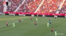 モヒカは身体を当てながら何とか食らいつくものの、それでも上回るのがヤマルだ。身体を入れながら止まると、背中を向けた状況から今度はモヒカの股の間にボールを通して再び突破。緩急とテクニックを駆使したドリブルでボックス内に侵入し、最後は右足でクロスを上げ切った。