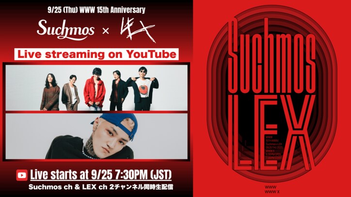 渋谷・WWWの15周年を記念したアニバーサリー企画として、9月25日(木)にWWW Xで開催されるSuchmosとLEXによるスペシャルツーマンライブ。 その模様が、YouTubeにて生配信されることが決定した。