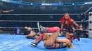 試合中盤、ソル組に好機が訪れる。コーナー下で相手がダウンすると、ソルがコーナー最上段へ。ザリアの両手を握ると、手を支えてにして頭上で倒立し、ツイストする形でダイブする。しかし、相手に避けられてしまい自爆する形となった。
