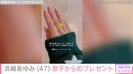 2児の母・浜崎あゆみ(47)、息子からもらったプレゼント公開「母きゅーーーーーーーん」 ABEMAエンタメ浜崎あゆみ 2025/10/24 10:10 【映像】浜崎あゆみの息子たち&息子からもらったプレゼント この記事の写真をみる(3枚) 2児の母で歌手の浜崎あゆみ(47)が、息子からもらったプレゼントを披露した。【映像】浜崎あゆみの息子たち&息子からもらったプレゼント 5歳と4歳、2人の男の子を育てている浜崎はこれまでにInstagramで、七五三での親子ショットや「めっちゃむずいゲームしてる…」とつづったゲームをする息子の写真など、家族の様子をたびたび公開していた。 23日はストーリーズを更新し、「息子が『目つぶって!』って言ってミッキーのリングはめてくれた。母きゅーーーーーーーん」とつづり、息子がプレゼントしてくれた黄色の指輪を披露した。 息子からもらったプレゼントを披露 1 2 【映像】浜崎あゆみ、背中のタトゥーが見えるリハーサル動画公開 【画像】浜崎あゆみ、2人の息子との七五三ショットを公開 浜崎あゆみ、ライブでの派手な衣装姿に反響 この記事の写真をみる(3枚) Twitter