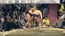 注目のシーンは十両五枚目・羽出山(玉ノ井)が十両四枚目・朝乃山(高砂)を押し出した一番でのこと。