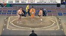 序二段八枚目・新屋敷(大嶽)と序二段八枚目・龍成山(出羽海)の一番での一コマ。1度目の立ち合いでは、新屋敷がやや先に出て龍成山が立ち遅れてしまい、タイミングは合わなかったものの、その後も勢い止まらず突き押しの攻防へ。これに行司の木村勝之介は「まだー!まだまだ!」と大声で左手を出しながら渾身の“待った”で制止した。33歳の龍成山は仕切り線に戻ると「すみません」と言って頭を下げた。