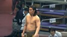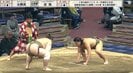 序二段七十二枚目・雷颯(雷)が序二段七十二枚目・北勝真(八角)を上手投げで下して今場所初白星を挙げた一番での一コマ。