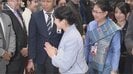 100人近い出迎えを前に笑顔で花束を受け取りました。