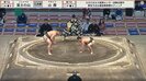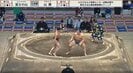 幕下五十枚目・山藤(出羽海)と幕下三十四枚目・富士の山(藤島)の一番。身長181.6センチ、体重72.7キロの細身で知られる22歳・山藤は立ち合い、飛び上がるように左に動いて攻めていった。対戦相手の身長182.6センチ、体重138.3キロの屈強な富士の山が突いてきたが、山藤はいなして相手の体勢を崩すと、すかさず潜り込んでまわしを奪取。そこから足技を駆使して豪快な投げに出た。