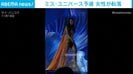ランウェイを颯爽と歩く女性――ミス・ユニバースのジャマイカ代表、ガブリエル・ヘンリーさんだ。この日はイブニングドレスとショール姿で美しさを競う。
