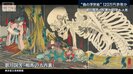 異彩を放つ迫力に、ひときわ目を引く巨大な骸骨。江戸末期、歌川国芳によって描かれた浮世絵『相馬の古内裏』です。朝廷に反旗を翻し、晒し首にされた平将門の無念を晴らそうと、娘の滝夜叉姫が妖術で骸骨を呼び寄せたシーン。繊細かつダイナミックな表現が時代を超えて人気を博し、近年ではナイキやユニクロのデザインにも採用されています。