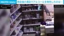 箱をつたい、棚の上部へ登ろうとする“侵入者”。足を滑らし落下してしまう。床に散乱した瓶の合間を千鳥足で歩いている様子が映っている。
