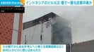 「高層階から各階にわたり窓が割れている。火元は1階とみられるが炎と煙は上へ」(藤富空リポート)
