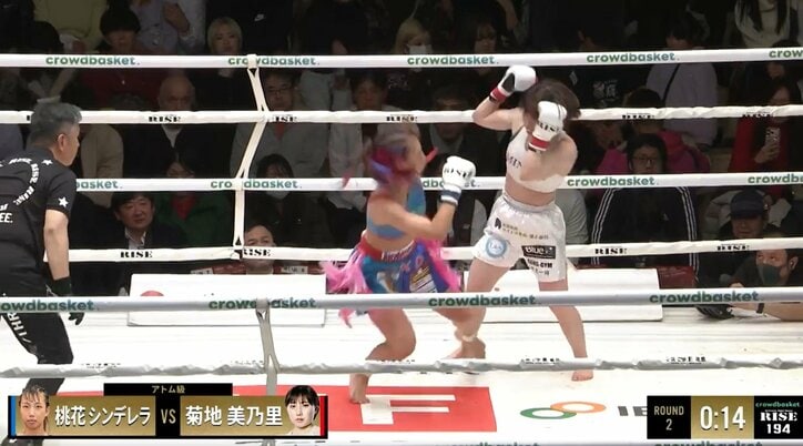 空手女子対決、起死回生のカウンターで“スコン”と落ちるもノーダウン判定「今ダウンしたよな」「最近フラッシュはとらない」反響さまざま RISE 2025/12/16 12:16 拡大する 現役女子王者同士の対決で、期待の18歳が圧倒的なスピードと攻撃力で対戦相手を圧倒。「パンチが速い」「これはいい選手」といった驚嘆の声が上がる中、劣勢だった選手が放った起死回生のカウンターで一瞬“スコン”とフラッシュダウン気味に落ちてヒザをつくヒヤリの場面が発生。ここはノーダウン判定で盤石の勝利を収めた一方、このシーンについて様々な反響が寄せられた。 12月14日、後楽園ホールで開催された「RISE194」で、桃花シンデレラ(山口道場)と菊地美乃里(GONG-GYM坂戸)が対戦。他団体王者同士による女子軽量級対決は、桃花がスピード感あふれる攻撃で菊地を圧倒し、その才能を示す3-0(30-27)のフルマークで判定勝ちを収めた。 続きを読む
